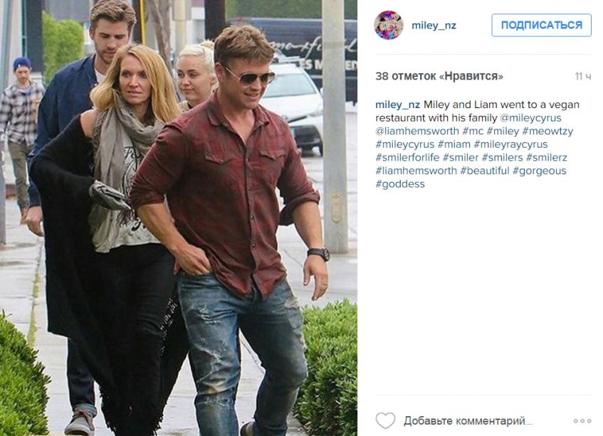 И так продолжалось до 8 апреля. В этот день звезды были замечены вместе на ужине с семьей Лиама, который состоялся в одном из вегетарианских ресторанов Лос-Анджелеса. Кроме влюбленных папарацци удалось запечатлеть братьев звезды фильма «Голодные игры» Криса и Люка, а также жену Люка — Саманту.