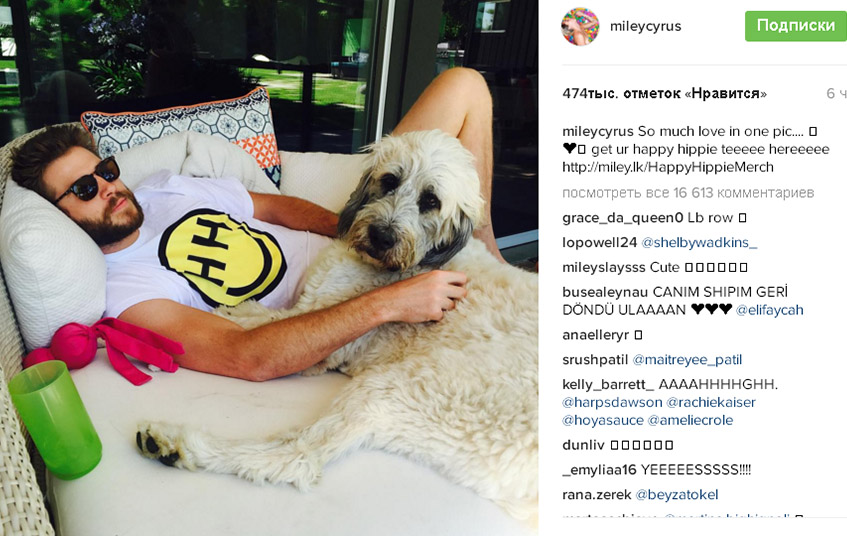 в Instagram Майли опубликовала фото Лиама, который лежит на кровати со своей собакой Дорой, выбирать в приюте которую, к слову, помогала Сайрус. «Так много любви в одном фото», — написала она. Лиам лежит в футболке благотворительного фонда артистки Happy Hippie. Отметим, что все средстваот продажи таких вот маек идут на помощь молодым людям, оказавшимся без крыши над головой.