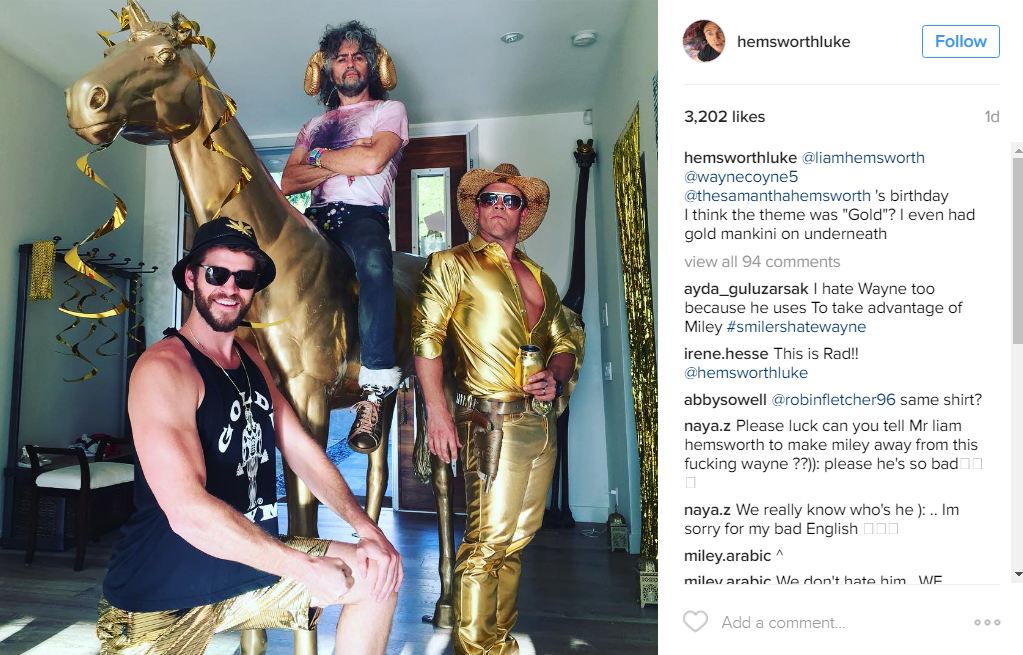 Майли Сайрус (23) и Лиам Хемсворт (26) – настоящая золотая молодежь. В прямом смысле этого слова! Вчера скандальная парочка веселилась на дне рождения жены Люка Хемсворта (35) Саманты. Тематика вечеринки – золото. Отсюда и фотографии Сайрус в золотой баскетбольной майке и Лиама в мерцающих шортах.