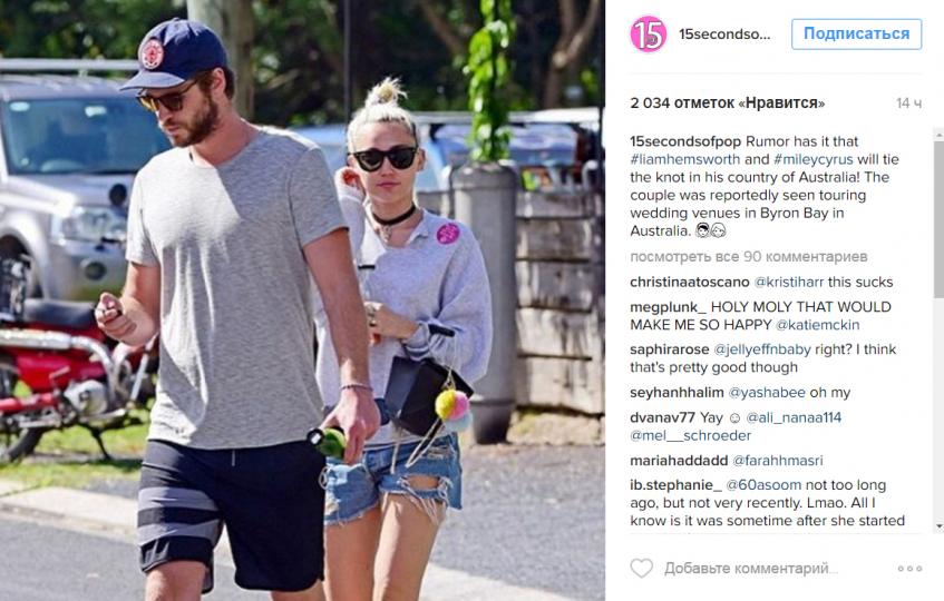 В начале 2016 года поклонники Майли Сайрус (23) и Лиама Хемсворта (26) были счастливы узнать, что после трех лет, которые бывшие влюбленные провели порознь, пара воссоединилась. А практически сразу после того, как эта радостная весть попала в СМИ, певица снова надела обручальное кольцо, которое когда-то ей подарил Лиам. Тогда же пошли слухи, что влюбленные активно готовятся к свадьбе. И хотя Лиам неоднократно заявлял, что о свадьбе говорить еще рано, поклонники уверены — церемония не за горами. И, возможно, они правы.