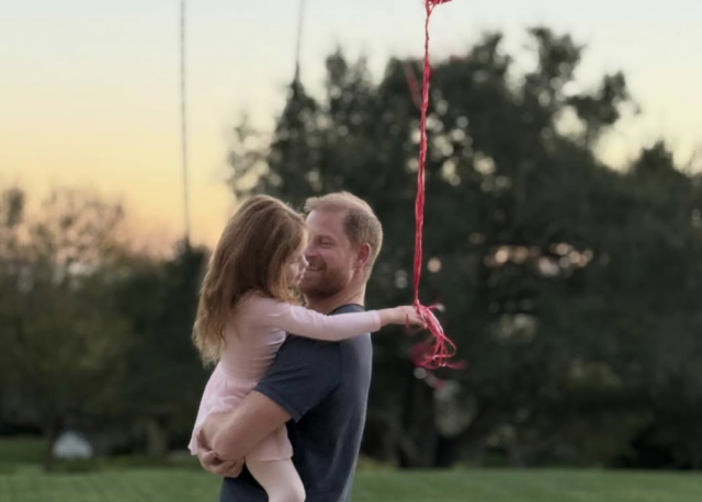 На фото принц Гарри держит на руках их четырехлетнюю дочь Лилибет, которая одета в розовое платье и держит шарики.