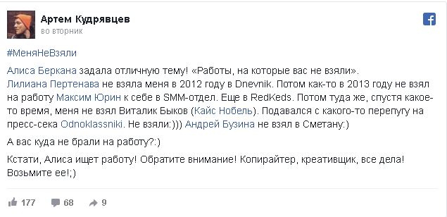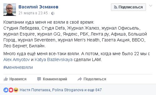 Как только появилась эта новость, в Сети запустился флешмоб #меняневзяли – под этим хэштегом пользователи Facebook и Instagram начали публиковать истории своих провалов: неудачное собеседование, отказ в музыкальной школе, коварные друзья, которые «не взяли пить пиво».