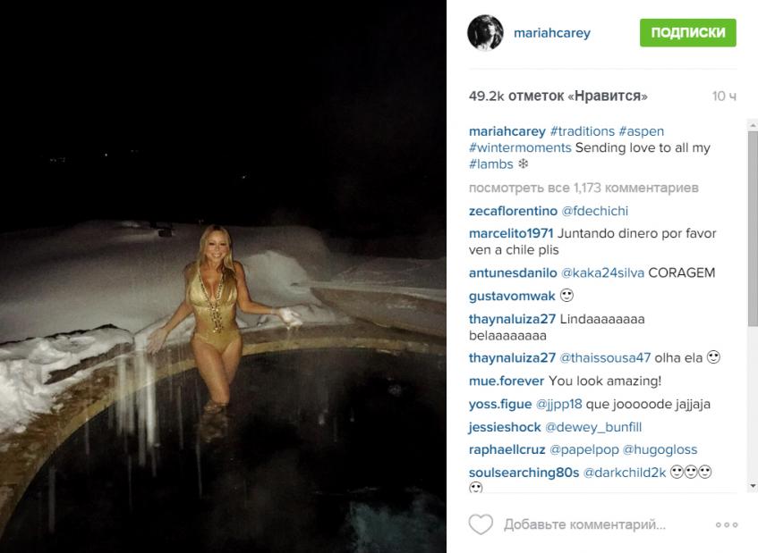 Сейчас Мэрайя отдыхает на горнолыжном курорте в Аспене (штат Колорадо). Но даже огромное количество снега и мороз не помешали певице пощеголять в золотом купальнике. Именно в нем звезда и запечатлена на снимке, который она опубликовала в Instagram.