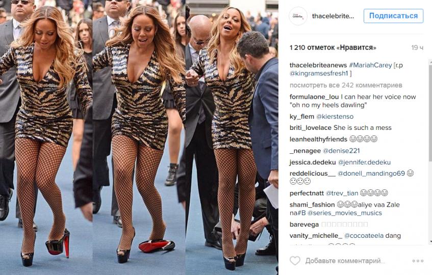 Вчера, 16 мая, состоялась презентация канала NBC, одной из гостьей которой и стала Мэрайя. Она приехала на мероприятие в блестящем платье и туфлях от Christian Louboutin, которые в итоге ее и подвели. Прямо на красной дорожке нога певицы выскочила из обуви, и девушка потеряла равновесие. Но тут ей помогли секьюрити, которые подхватили падающую звезду и помогли ей надеть туфлю. Хорошо, что рядом с Мэрайей оказались такие крепкие мужчины, ведь могло произойти то же, что и с Меган Трэйнор (22)!