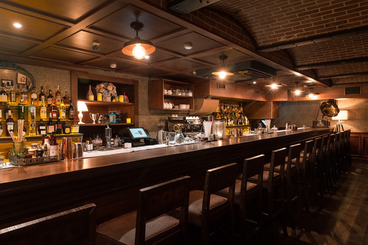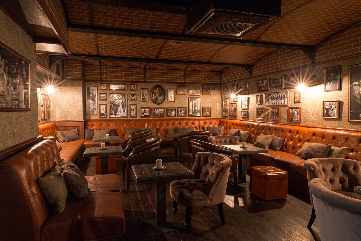 Под крышей одного фактически уместились два бара с разной атмосферой. Наверху в середине зала висит люстра с абажурами в виде шляп, бра в форме бандитов с платками на лицах и антикварные фотографии преступниц. Основную часть помещения занимает огромная, без малого 20 метров, барная стойка, за которой одновременно работают не меньше десяти барменов, где играет живая музыка.