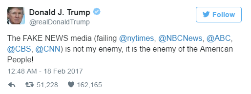 «СМИ «Ложные новости» (провалившиеся New-York Times, NBC News, ABC, CBS, CNN) – не мои враги, а враги американского народа!» — появилось в Twitter Дональда.