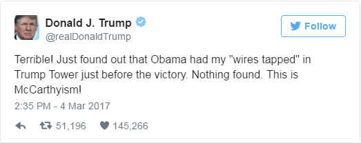 «Ужасно! Только что узнал, что Обама прослушивал телефоны в Trump Tower перед самой победой. Ничего не найдено. Это маккартизм!», — написал Трамп.