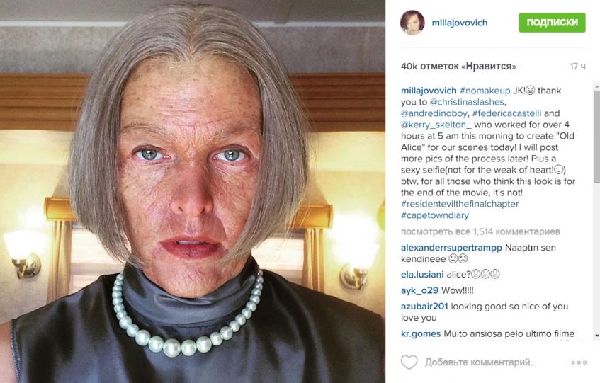 На снимке, который Мила выложила 18 ноября, актриса постарела на 50 лет. На ее лице появилось огромное количество морщин и пигментных пятен, а волосы поседели. Звезда поспешила успокоить фанатов, назвав имена гримеров, которые работали над таким перевоплощением: «Они работали с пяти утра более четырех часов, чтобы создать «постаревшую Элис» для сегодняшних съемок. Я размещу больше фото процесса и сексуальное селфи (не для слабонервных) чуть позже. Кстати, для тех, кто думает, что так я буду выглядеть в конце фильма – это не так!»