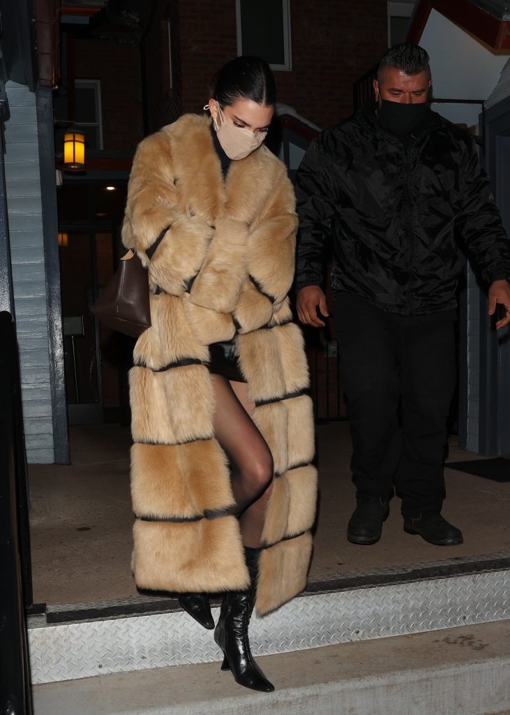 Даже в заснеженном Аспене Кендалл не изменяет себе. Для ужина Дженнер выбрала экстремальную кожаную мини-юбку от Fidan Novruzova, черную водолазку и сапоги на каблуке. Фишкой образа стала шуба из альпаки.