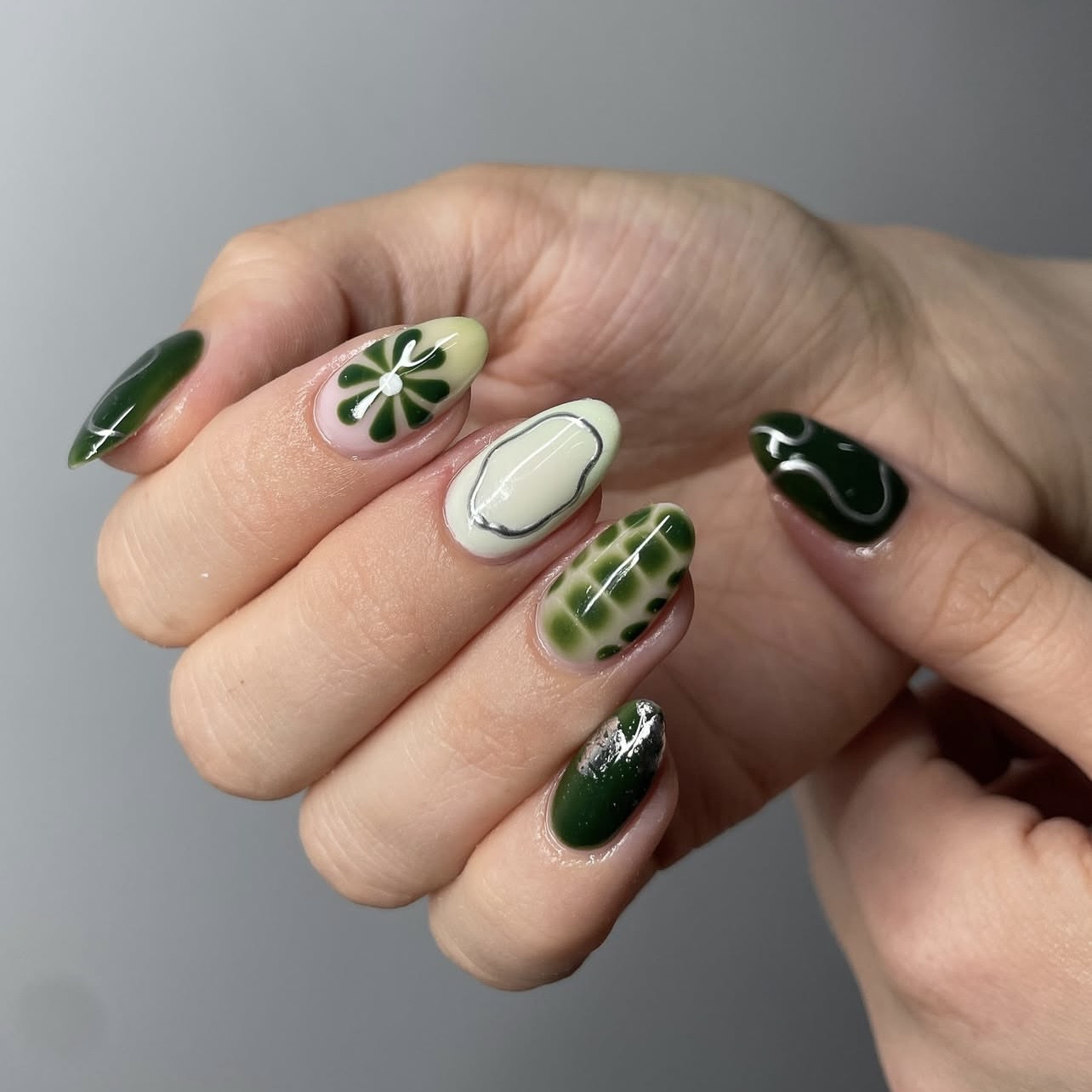 После долгой борьбы с нюдом инфлюенсеры наконец-то решили вернуться к яркости и самовыражению. Оттенок мха – идеальный вариант для весеннего маникюра. Это не салатовый из 2010-х, а благородный цвет, находящийся где-то между тоном матча-латте и еловых веток. С таким цветом классно будет смотреться как однотон, так и сложный нейл-арт.