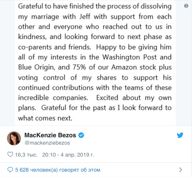 «Я рада, что процесс расторжения брака с Джеффом завершился при взаимной поддержке», — написала Маккензи. Она сообщила, что теперь ей «не терпится реализовать собственные планы» и поблагодарила мужа за прошлое. Джефф Безос с своем Twitter также поблагодарил ее «за доброту и поддержку» и отметил, что в течение 25 лет брака Маккензи была «замечательным партнером, союзником и матерью».