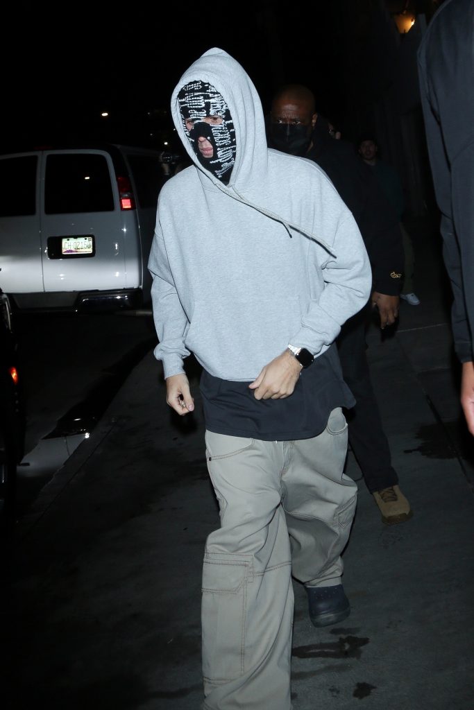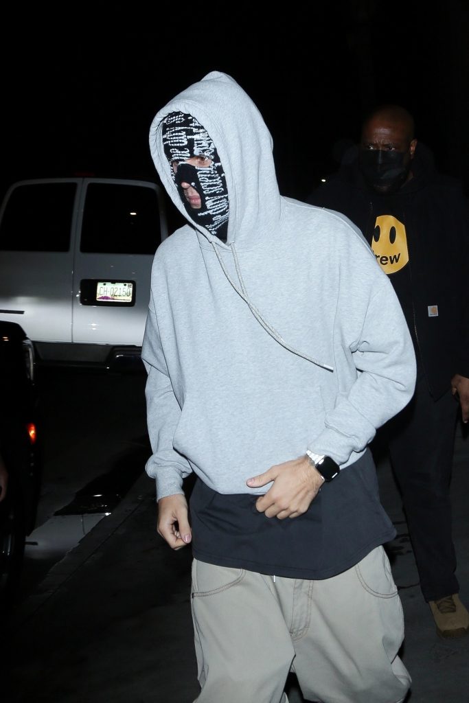Джастин, в свою очередь, прибыл на церковную службу в черной базовой футболке, сером худи, oversize брюках и обуви от Crocs. Дополнением к образу послужила балаклава и черные очки. Кажется, так, Бибер хотел скрыться от назойливых папарацци.