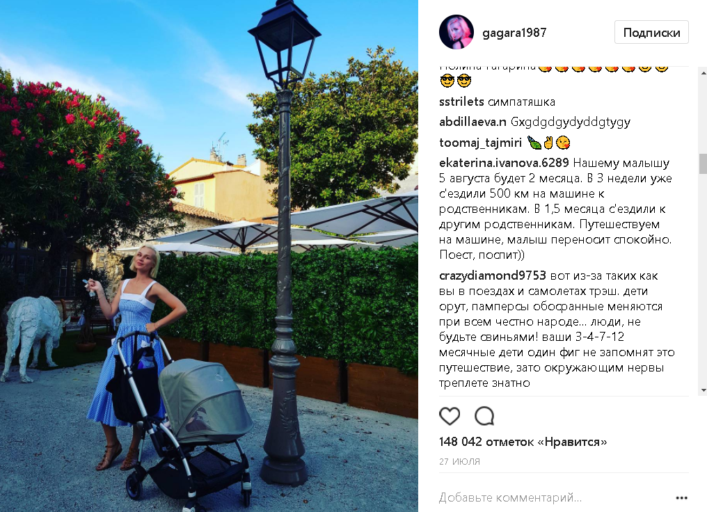Не повезло и Полине Гагариной (30), которая в конце апреля родила дочь Мию и недавно вернулась из отпуска на Лазурном Берегу: подписчикам не понравилось, что Полина взяла в семейное путешествие и крошку-дочку. «Вот из-за таких, как вы в поездах и самолетах ужас. Дети орут… Люди, не будьте свиньями! Ваши 3-4-7-месячные дети все равно не запомнят это путешествие, зато окружающим нервы треплете знатно!», — написали в комментариях к снимку Полины с отдыха.