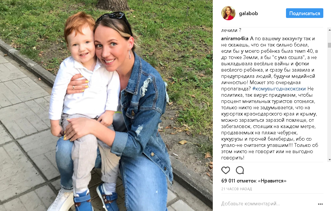 Галина Боб (32), которая вернулась из отпуска в Турции, вчера рассказала в Instagram о том, что ее сын Лева (2) подхватил сильную инфекцию с температурой под 40 градусов и гнойными высыпаниями. И хотя многие стали поддерживать молодую маму (напомним, в конце апреля она родила сына), нашлись и злые комментаторы: «А по Вашему аккаунту так и не скажешь, что он так сильно болел. Если бы у моего ребёнка была температура 40, в другой точке Земли, я бы с ума сошла, а не выкладывала весёлые вайны и фотки весёлого ребёнка, и сразу бы заявила и предупредила людей, будучи медийной личностью!»