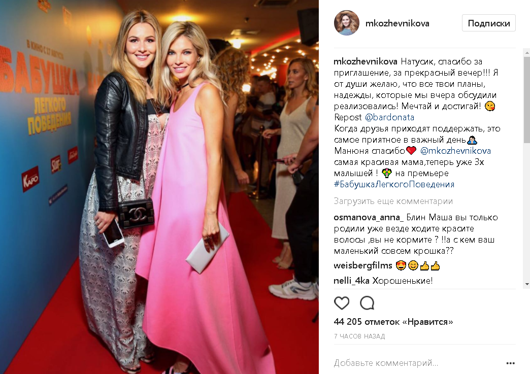 Но у некоторых пользователей Instagram другое мнение. Фотографию Марии с премьеры осудили! По мнению комментаторов, молодая мать не должна оставлять ребенка дома, а сама уходить на премьеру. И если одни просто настойчиво интересовались: «А с кем же ваш маленький совсем крошка?», то другие критиковали: «Я не могу ребенка на одну ночь с бабушкой оставить, меня совесть мучает. А вы двоих спокойно оставляли, а теперь совсем маленького еще. Как научиться такому безразличию…»