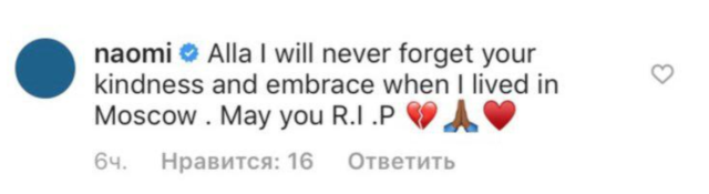 «Дорогая Алла, я уже скучаю по тебе. Не могу попрощаться… Всегда буду любить. Альбер. Так грустно. Каждый раз, когда кто-то, кого мы любим, покидает нас, я чувствую себя менее любимым…», — написал дизайнер Альбер Эльбаз.