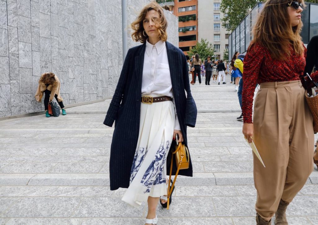 Носи сандали с юбкой миди, базовой рубашкой и легким пальто