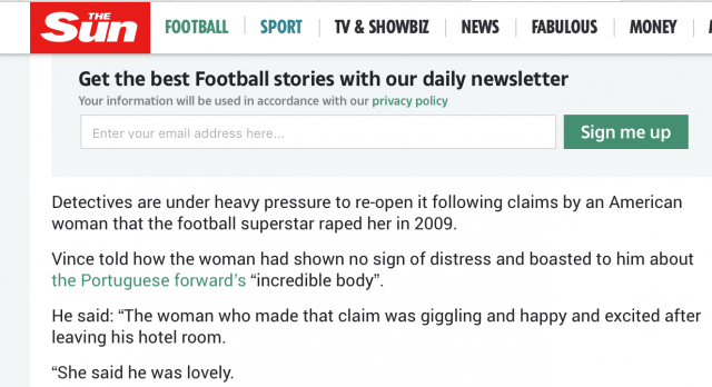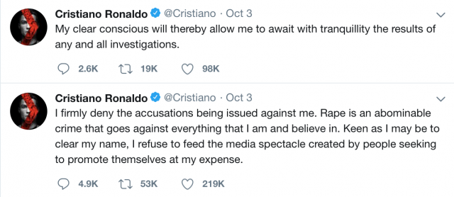Роналду сразу же поспешил объясниться в Twitter: «Я категорически отрицаю обвинения, выдвигаемые против меня. Изнасилование — это отвратительное преступление, которое противоречит всему, во что я и верю. Я как я могу стараюсь очистить свое имя, поэтому и отказываюсь подкармливать образ, созданный СМИ и людьми, которые хотят прославиться за мой счёт. Таким образом, я буду ждать результатов расследования».
