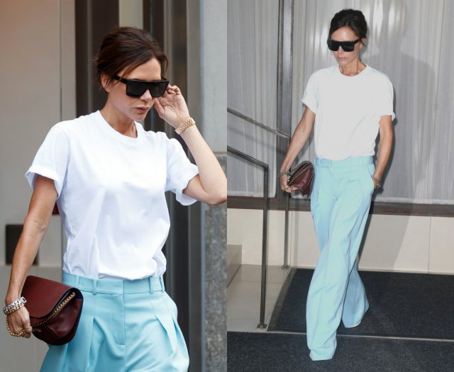И вот, новый выход. Дизайнер выходила из своего отеля на Манхэттене. в белой футболке и широких брюках нежно-голубого цвета.