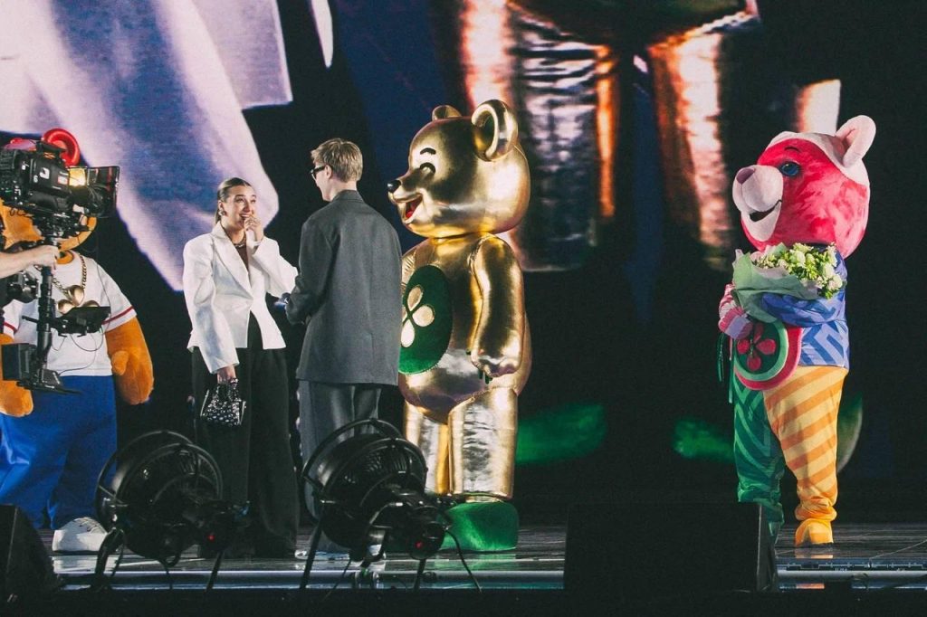 Никита стал победителем конкурса, устроенного «Перекрёстком»: его история, записанная на кружок в Telegram-бот, показалась организатором самой трогательной и милой. После символичной песни «Я просто люблю тебя» он вышел на сцену в компании «ЛакиМишек», талисманов супермаркета, приносящих удачу, которые вынесли кольцо и роскошный букет цветов.
