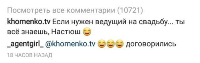 И сегодня блогер Александр Хоменко решил тоже поздравить пару и предложить свои услуги ведущего на свадьбе: «Если нужен ведущий на свадьбу, ты все знаешь, Настюш», — написал он в комментариях. А Настя ответила: «Договорились!». Понятное дело, просто шутка, но и она дала поклонникам немало поводов для обсуждения.