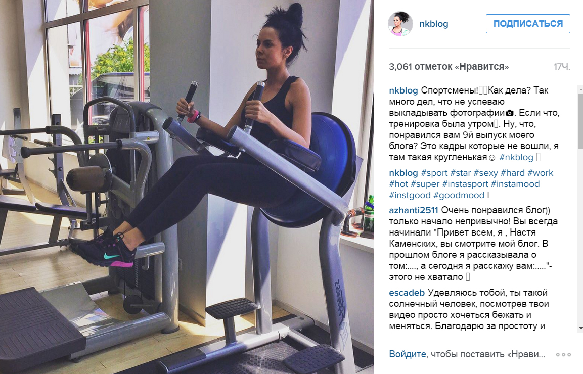 Меньше недели осталось до того дня, когда эксперимент по похудению Насти Каменских (28) будет завершен. Мы не сомневаемся, что Настя не только выполнила, но и перевыполнила план, так как все свободное время она отдает занятиям спорту. Певица так много занимается, что иногда даже не успевает поделиться всем со своими фанатами.