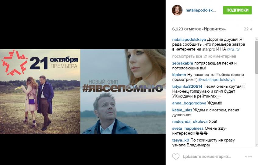 Об этом Наталья рассказала поклонникам 20 октября в своем Instagram: «Дорогие друзья! Я рада сообщить , что премьера завтра в интернете на starpro И НА @ru_tv». Фанаты, которые с радостью приветствовали тизеры будущего клипа, не могли не прокомментировать радостную новость: «Ну наконец-то!», «Ура-ура-ура! Ждем!» И вот долгожданное видео появилось и в сети.