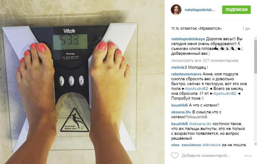 24 августа в Instagram Натальи появилась фотография, на которой запечатлены ноги звезды и весы, которые остановились на отметке в 53,3 кг. «Дорогие весы!!! Вы сегодня меня очень обрадовали!!! К съемкам клипа готова. Добеременный вес», — написала певица.