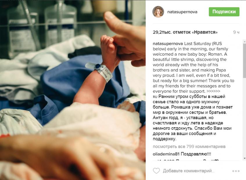 Малыш родился еще в минувшую субботу (4 июня), но Наталья сообщила о радостном событии только сейчас, опубликовав в своем Instagram первое трогательное фото мальчика, которого назвали Романом. «Ранним утром субботы в нашей семье стало на одного мужчину больше. Ромашка уже дома и познает мир в окружении сестры и братьев. Антуан горд, я уставшая, но счастливая и жду лета в надежде немного отдохнуть. Спасибо вам, мои дорогие, за ваши сообщения и поддержку», — написала звезда под снимком.