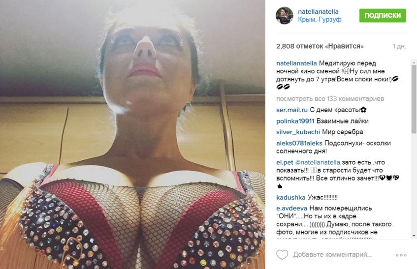 Сейчас Наташа находится в Крыму, где участвует в съемках фильма «Домик на юге». Конечно, звезда делится подробностями процесса со своими поклонниками. 9 сентября певица написала: «Медитирую перед ночной кино сменой! Ну сил мне дотянуть до 7 утра! Всем споки ноки!» На снимке Наталья была сфотографирована таким образом, что большую часть кадра занимало ее декольте.