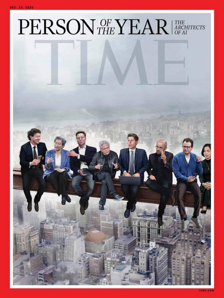 Новая обложка представляет собой отсылку к знаменитому снимку «Обед на небоскребе». На ней изображены руководители крупнейших компаний в сфере ИИ – глава Meta* Марк Цукерберг, CEO AMD Лиза Су, руководитель запрещенной X, SpaceX и Tesla Илон Маск, глава OpenAI Сэм Альтман, глава Nvidia Дженсен Хуанг, CEO DeepMind Демис Хассабис, руководитель Anthropic Дарио Амодей и создательница ImageNet Фэй-Фэй Ли.