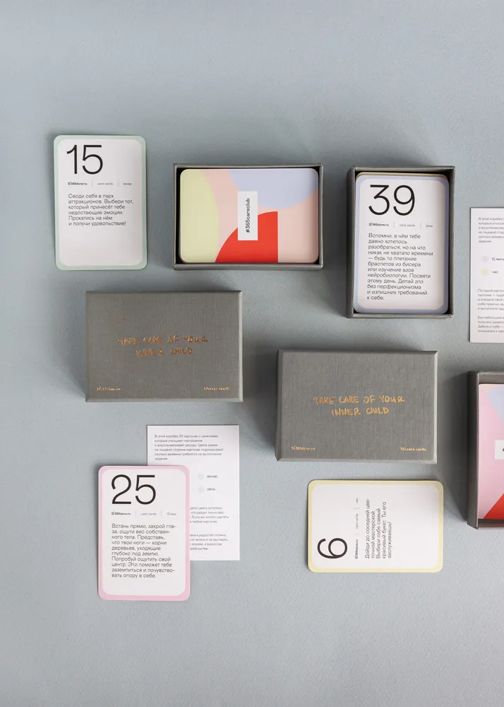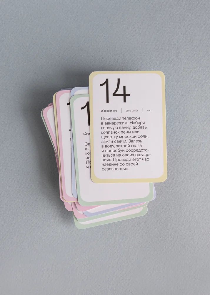 В этой коробке тебя ждут 50 карточек с занятиями, которые улучшают настроение и восстанавливают ресурс. Так что если хочешь сделать себе приятно – вытяни любую из карт и выполни задание. За то, что это отнимет много времени, кстати, можно не переживать – цвета рамок на лицевой стороне карты подсказывают, сколько времени требуется на выполнение задания (от 15-и минут до целого дня).