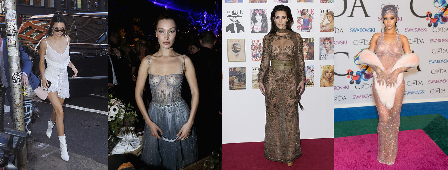 Каких только рискованных образов не было у Ким Кардашьян (36)! Прозрачное боди, латексное платье, корсет поверх футболки. Так что выходами без белья Ким никого не удивить.