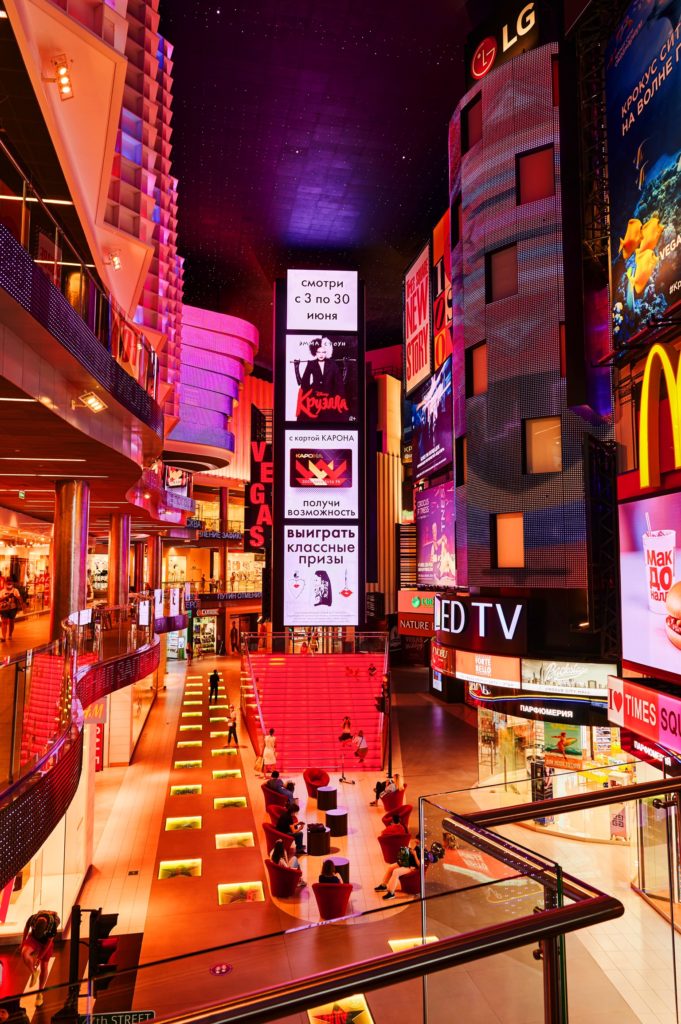 В VEGAS «Крокус Сити» можно увидеть точно воссозданные копии самых известных улиц Нью-Йорка: Times Square, Rockefeller Center, Madison Avenue и 47th Street. Бегущие строки, экраны – все как по-настоящему. VEGAS «Каширское шоссе» открывает портал на самую роскошную торговую улицу мира – японскую Ginza, которая так и манит неоновыми вывесками и небоскребами в миниатюре. В каждом VEGAS представлена уникальная Аллея славы: здесь собраны автографы мировых звезд и селебрити, от Милы Йовович до Брэдли Купера.