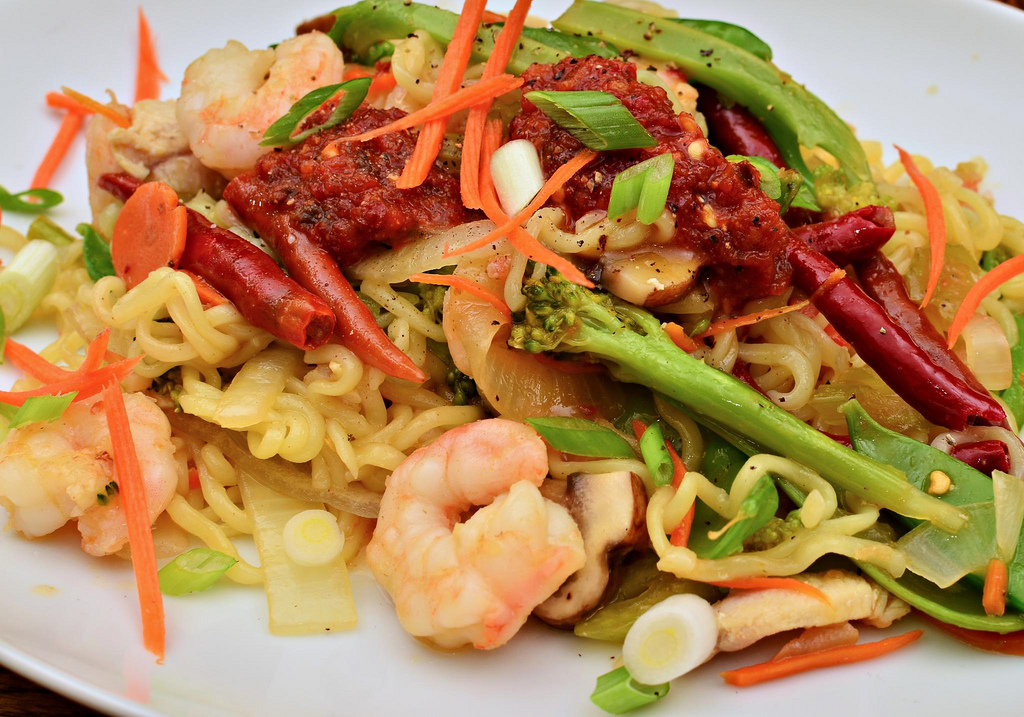 Разогрей растительное масло, обжарь в нем измельченный чеснок и смесь специй для моркови по-корейски. Из очищенного от кожуры яблока вынь сердцевину, нарежь ее тонкими дольками. Теперь очищенные креветки брось в кипяток на 10–15 секунд, достань и дай им остыть. Отложи несколько штук для украшения, а остальные нарежь – примерно на три-четыре части каждую. Далее нашинкуй капусту, соедини ее с яблоком и креветками. Смешай уксус, оливковое масло, обжаренный со специями чеснок, соль и перец. Заправь салат и подавай.