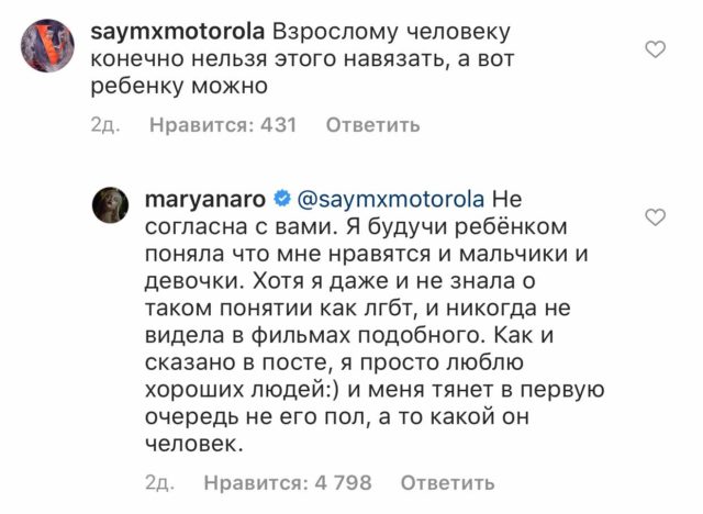 «Я еще ребенком поняла, что мне нравятся и мальчики, и девочки. Хотя я даже и не знала о таком понятии как лгбт, и никогда не видела в фильмах подобного. Как и сказано в посте, я просто люблю хороших людей, и меня тянет в первую очередь не его пол, а то какой он человек», — поделилась Марьяна Ро.