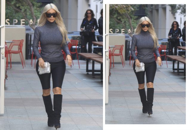 В выходные Ким Кардашьян (36) прилетела в Сан-Франциско на съемки новых серий шоу «Семейство Кардашьян». Образ Ким был очень спокойный (иногда она надевает пиджак на одно только белье), но в этот раз решила прикрыться: серая водолазка, лосины до колен, высокие сапоги и сумка Paco Rabanne.