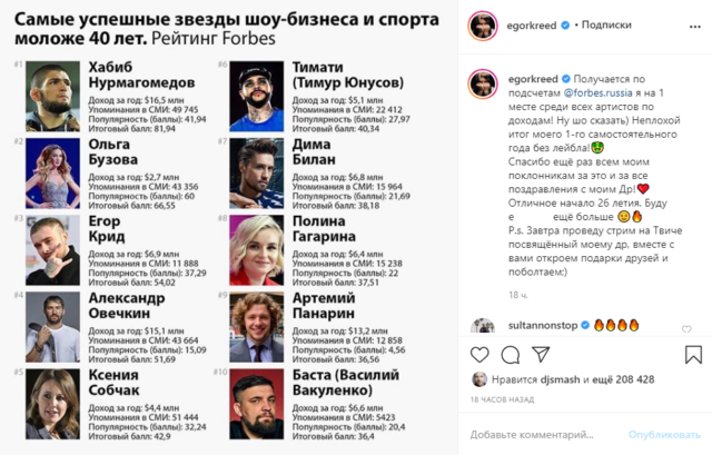 Вот, как прокомментировал рэпер свой успех: «Получается, по подсчетам @forbes.russia я на 1 месте среди всех артистов по доходам! Ну, что сказать. Неплохой итог моего 1-го самостоятельного года без лейбла!
