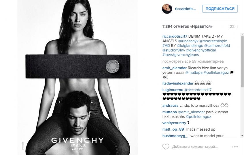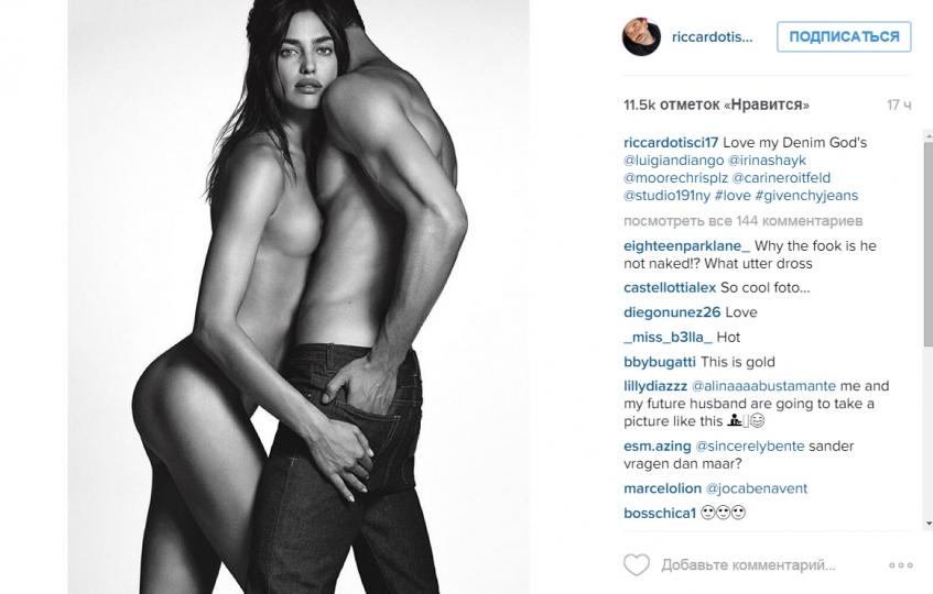 Новые откровенные черно-белые фото, на которых Ирина появляется топлес в компании своего коллеги Криса Мура, опубликовал в своем Instagram модельер Риккардо Тиши (41), написав под одним из снимков: «Люблю своих джинсовых богов».