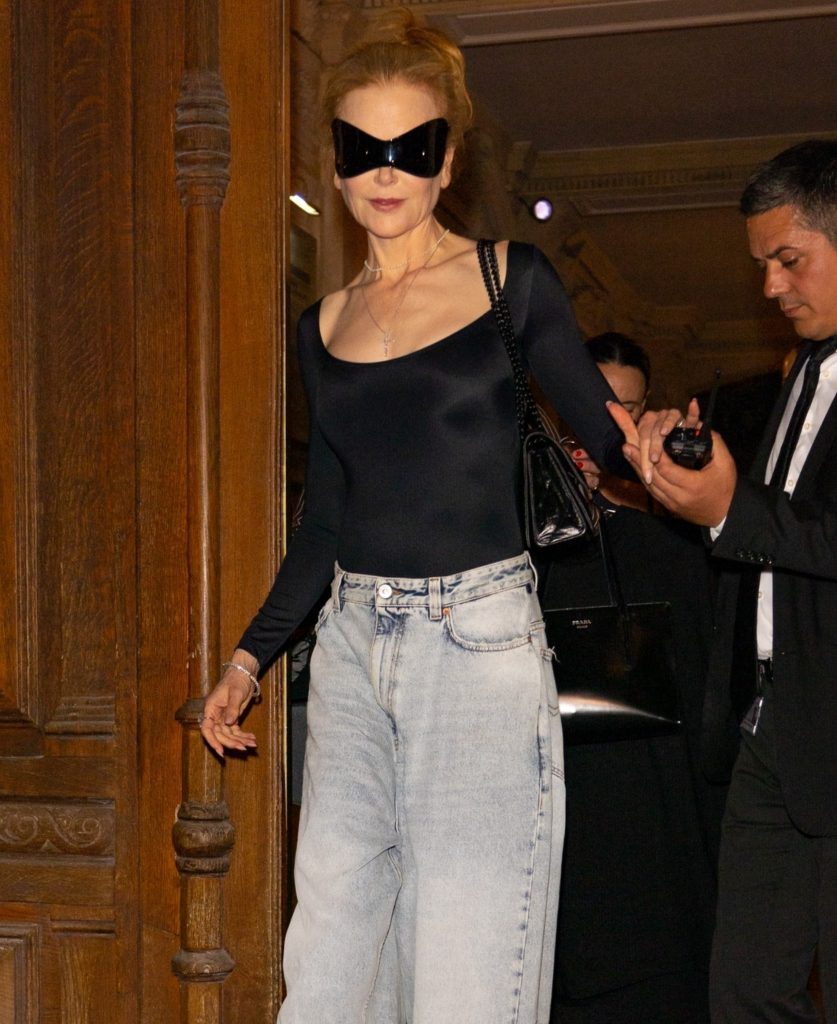 В целом, весь образ Николь Кидман выглядел очень эффектно и нетипично для актрисы. Звезда кино надела базовое черное боди и широкие светлые джинсы, из-под которых виднеелся острый мыс ее обуви.