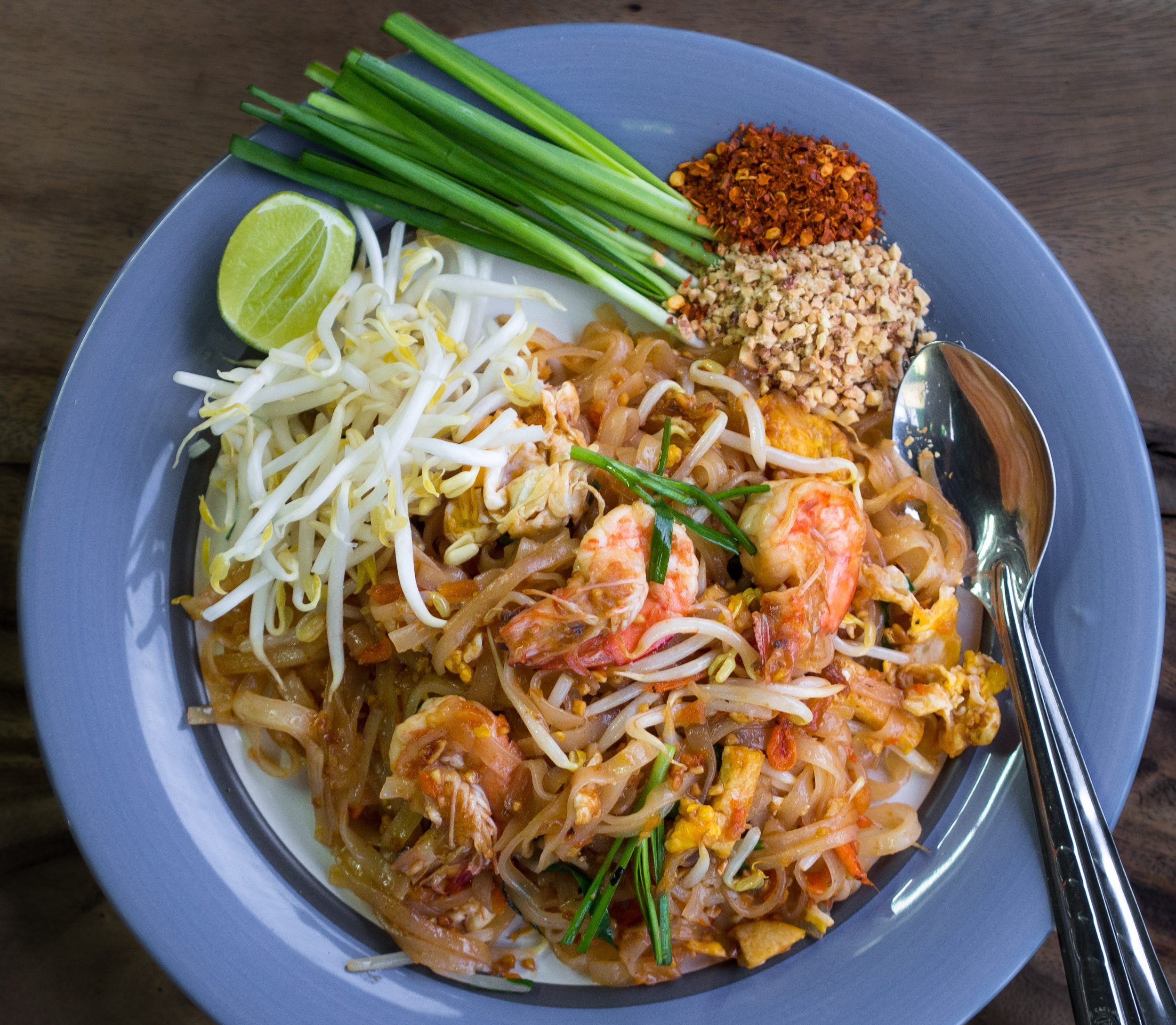 Теперь добавь к лапше и овощам креветки, все перемешай и обжаривай, помешивая, две минуты. После можешь подавать блюдо на стол.