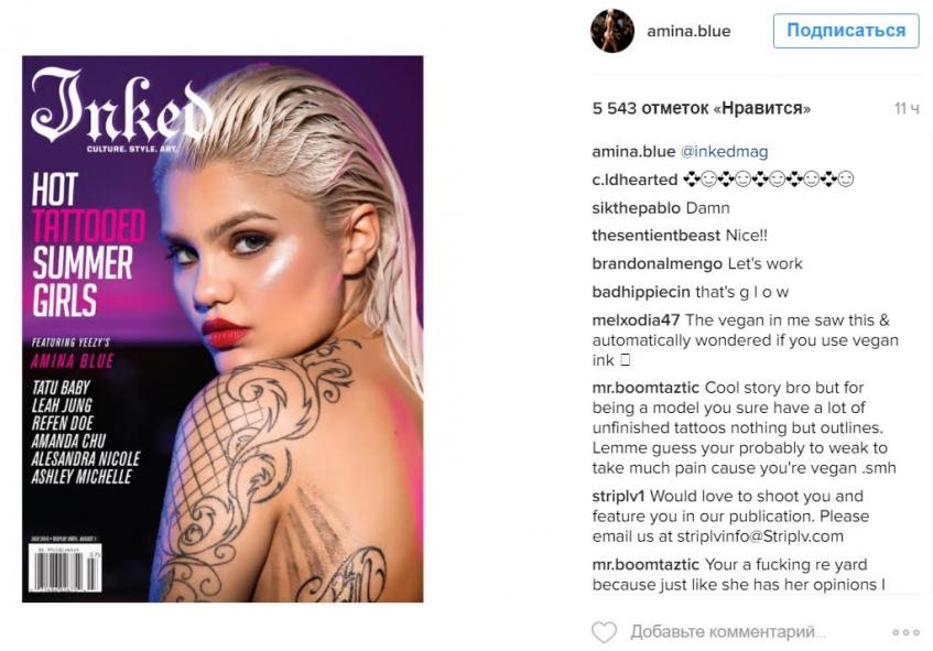 Сегодня стало известно, что Амина снялась для журнала Inked полностью обнаженной! Издание специализируется на дизайне татуировок, и модель с удовольствием продемонстрировала свои рисунки на теле, а также поделилась историями их создания.