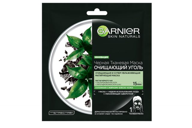 Черная тканевая маска «Очищающий уголь с листьями черного чая», Garnier, 160 р.