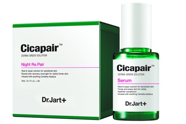 Восстанавливающая сыворотка (5320 р.) и восстанавливающая ночная крем-маска «Антистресс» (6300 р.) из линии для чувствительной кожи Cicapair, Dr.Jart