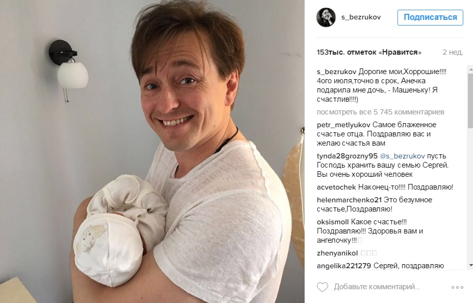 Месяц назад у актера Сергея Безрукова (42) и режиссера Анны Матисон (33) родилась дочь Маша. И первую фотографию дочки новоиспеченный папа опубликовал в тот же день.