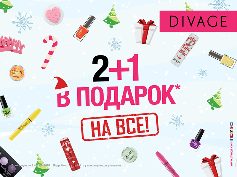 Во всех магазинах Divage make up studio проходит акция «2 + 1 в подарок на все товары!». В подарок выдается продукт наименьшей или равной стоимости.