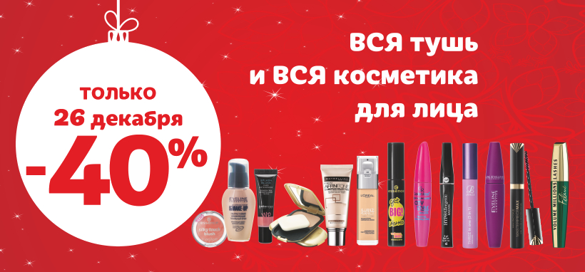 26 декабря – только один день вся декоративная косметика со скидкой 40%.