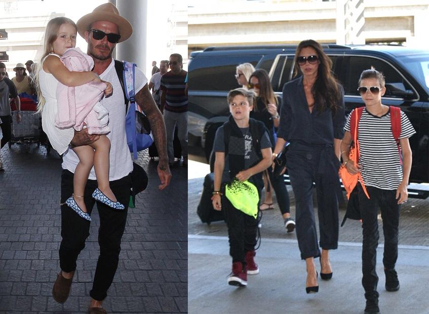 Папарацци удалось заснять Бекхэмов, когда они входили в аэропорт Лос-Анджелеса, чтобы сесть в самолет до Британии. В центре внимания оказалась малышка Харпер (4), которая гордо восседала на руках своего отца, одетого в белую майку, черные джинсы, бежевую широкополую шляпу и замшевые ботинки.