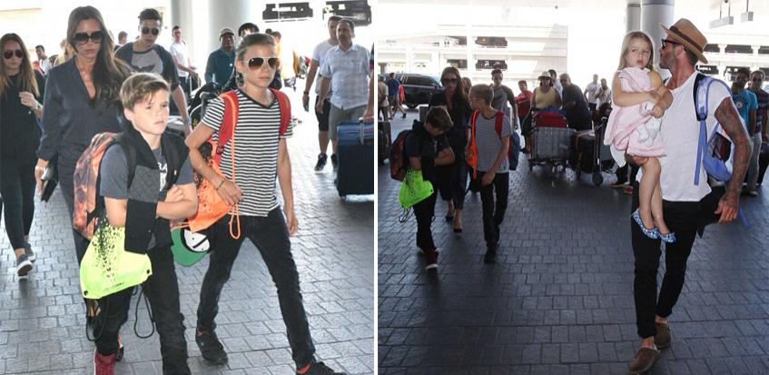 Папарацци удалось заснять Бекхэмов, когда они входили в аэропорт Лос-Анджелеса, чтобы сесть в самолет до Британии. В центре внимания оказалась малышка Харпер (4), которая гордо восседала на руках своего отца, одетого в белую майку, черные джинсы, бежевую широкополую шляпу и замшевые ботинки.