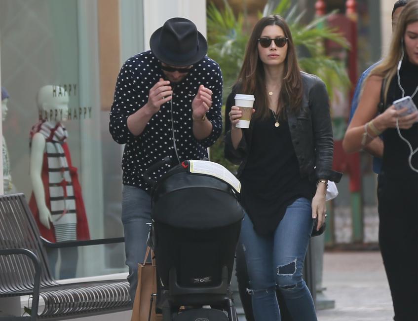 Произошло это 9 декабря в магазине The Grove в Лос-Анджелесе, куда Джессика и Джастин привели малыша. Тогда-то папарацци и застали пару с коляской. Стоит отметить, что Джессика, одетая в джинсы, темную кофту и кожаную куртку, в этот день явно решила немного отдохнуть от материнских обязанностей и поручила везти коляску с сыном Джастину, который надел темные джинсы, черную рубашку в горошек и шляпу.